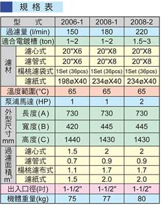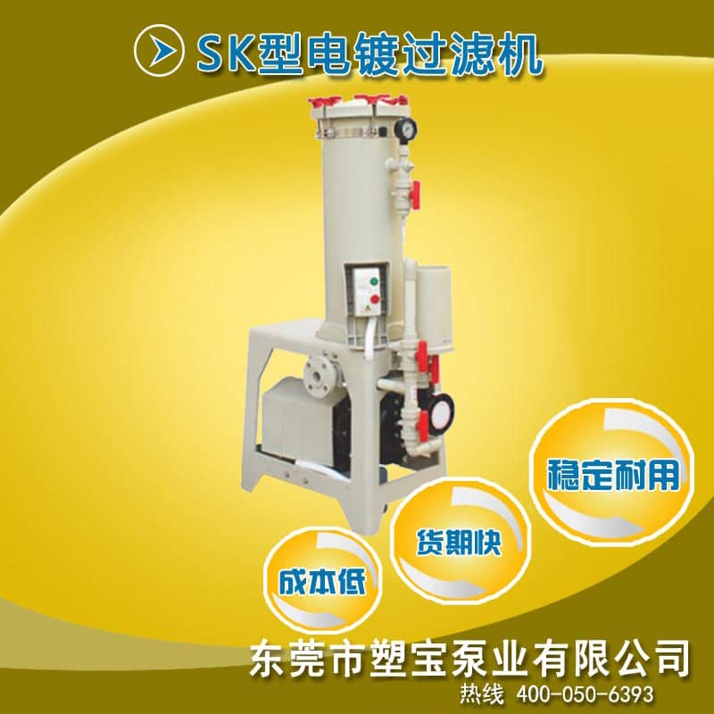 電鍍液過濾機(jī)特點(diǎn): 1、過濾機(jī)主體及各重要零件,均采PP塑鋼材料一體成型開模生產(chǎn),達(dá)到焊接點(diǎn)少、防漏液性佳的 點(diǎn),及具有耐高溫、耐酸堿等特性。 2、安 開關(guān)保護(hù)裝置,當(dāng)馬達(dá)過載或單相運(yùn)轉(zhuǎn)時,安 開關(guān)層自動切斷電源。 3、馬達(dá)防護(hù)罩,確保馬達(dá)在酸氣中不易受腐蝕。 4、高精制過濾、過濾面積廣、效率高、操作簡單、清洗容易。 5、可依客戶選擇不同濾材之變化,另可加裝活性碳快速攪拌循環(huán)回路處理裝置,操作簡單。 6、附底閥1個,PVC視流器1個,依客戶選擇PVC或PP法蘭1組。 7、另有鈦金屬束環(huán)組可供選擇。 電鍍液過濾機(jī)參數(shù)表: