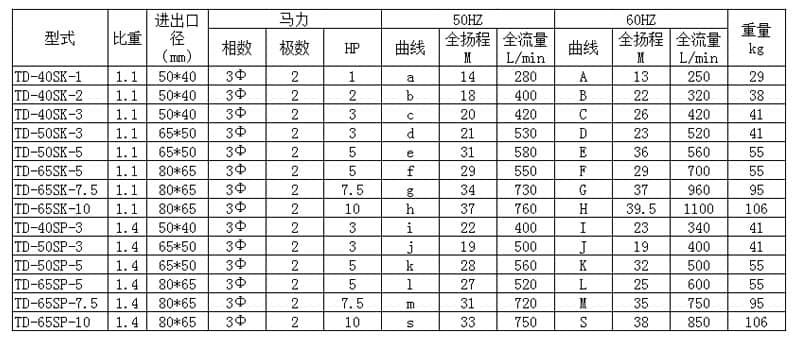 塑寶TD型耐酸堿立式泵選型參數(shù)表: