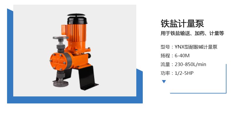 (Fe3+)的鹽,高分子聚合鐵鹽是一種新型的凈水劑,主要用于自來水、工業給水的凈化處理,是一種能完全可以滿足國家新的飲用水衛生規范需求的首選藥劑;同時在處理各種工業廢水、生活污水方面,按其性價比,在絕大部分水體中要優于傳統的鋁鹽藥劑。鐵鹽輸送時對泵的要求很高,具體的選型可以咨詢我們的產品經理。